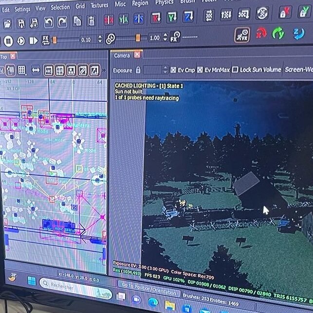 A person is operating a professional video camera amidst a warm, ambient lighting setting. The equipment is mounted on a rig, and the scene appears to be part of a film or video production environment.