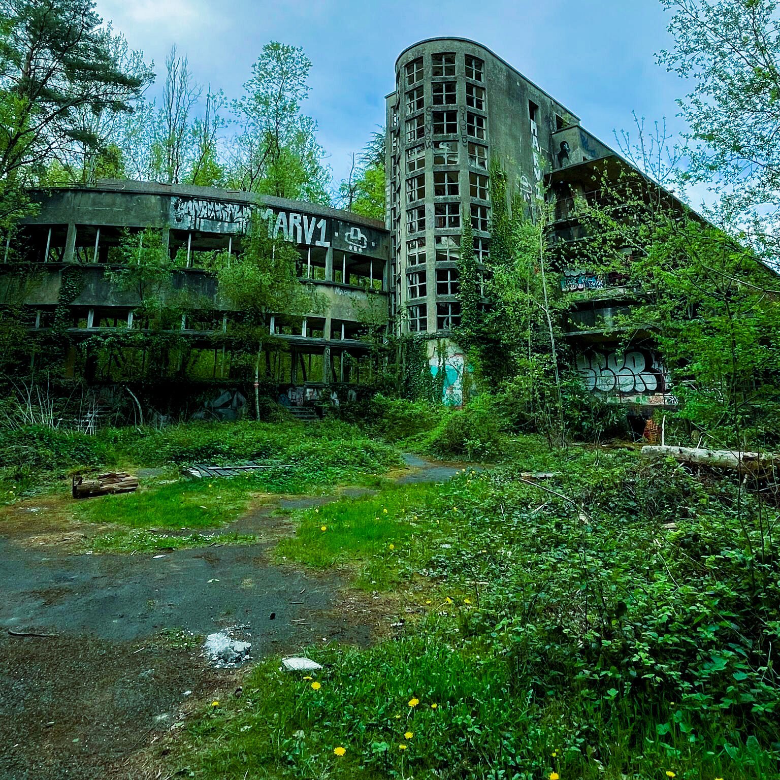 A professional video camera mounted on a tripod stands between two vertical LED lights in a dimly lit environment, giving the scene a cinematic look.
